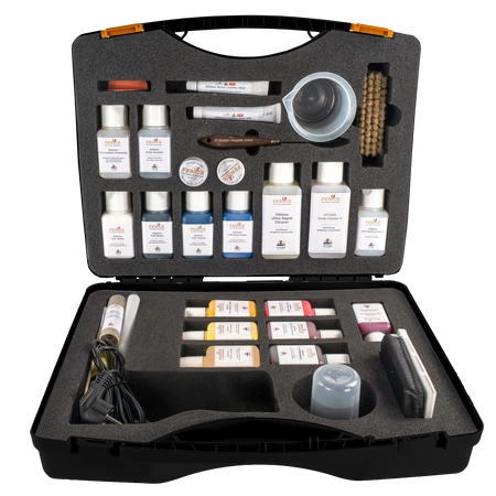 Zestaw serwisowy przeznaczony do retuszu uszkodzeń na powierzchni samochodowej tapicerki skórzanej. Walizka FE 102 bazowa jest kompletem retuszerskim, walizka FE 103 jest zestawem uzupełniającym zawierającym produkty do renowacji.