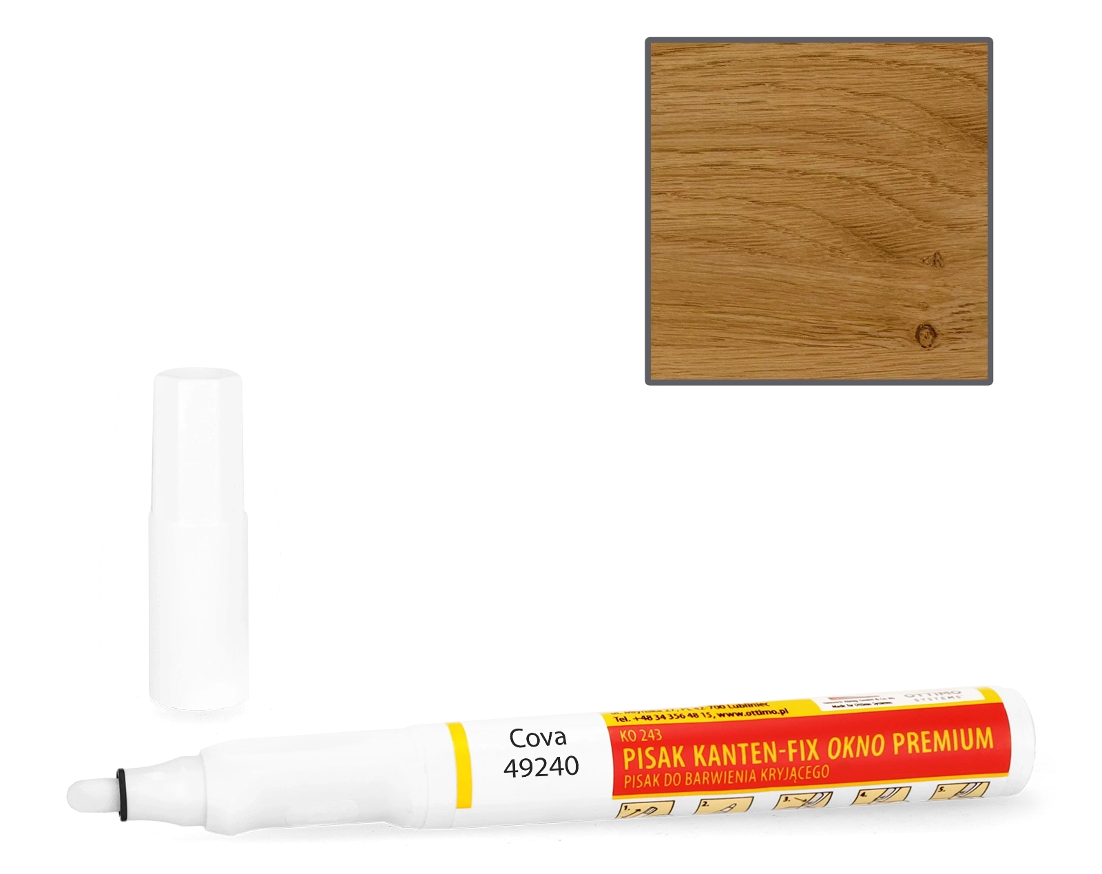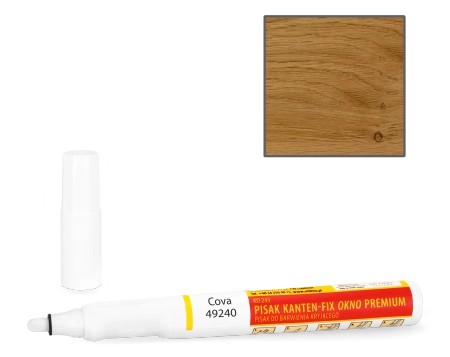 Pisak retuszerski KANTEN-FIX OKNO z szybkoschnącą, wodoodporną, samoutwardzalną, akrylową farbą kryjącą. Do barwienia naroży okiennych i innych uszkodzeń na profilach okiennych z drewna i PVC. Szczególnie przydatny w procesie produkcji stolarki otworowej do barwienia miejsc połączeń kątowych. Może być stosowany także do naprawy krawędzi mebli, drzwi oraz innych powierzchni z drewna, płyt czy tworzyw sztucznych. Do zastosowań wewnątrz pomieszczeń i na zewnątrz. Farba odporna na niekorzystne działanie czynników atmosferycznych. Mazak przed użyciem wymaga aktywacji (szczegóły w instrukcji).