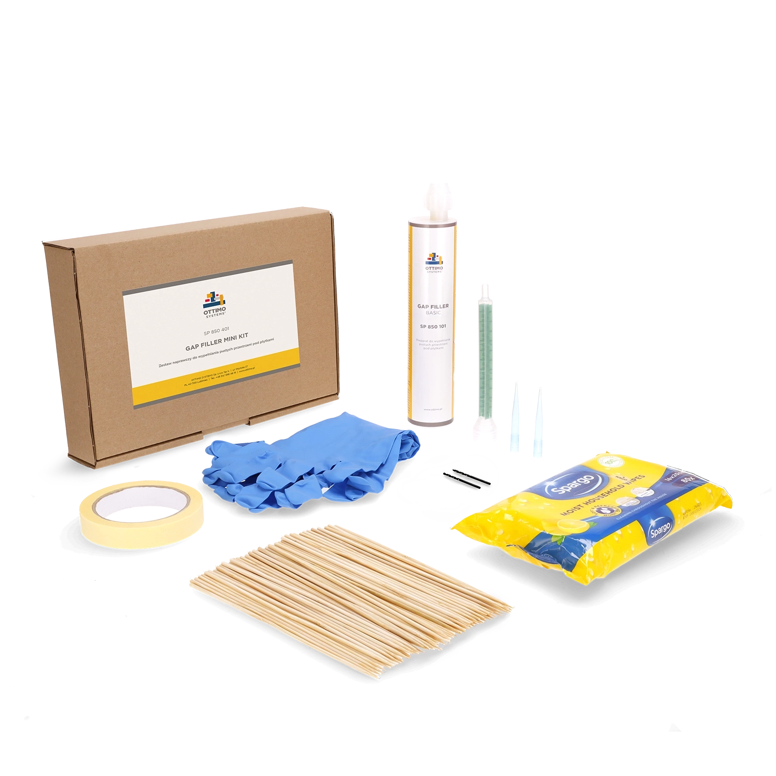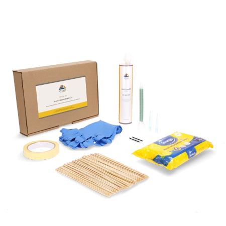 Podstawowy zestaw do wypełniania pustych przestrzeni pod płytkami podłogowymi i ściennymi. Pomaga pozbyć się efektu "głuchych" płytek bez konieczności demontażu podłoża. Naprawa przebiega w bezpieczny sposób, bez ryzyka pękania, podnoszenia lub odspajania płytek. Zestaw zawiera innowacyjny preparat wypełniający SP 850 101 Gap Filler Basic, komplet narzędzi niezbędnych do wykonania naprawy oraz instruktaż naprawy krok po kroku. Wszystko zapakowane w pudełko z ekologicznego materiału. Kartusz z preparatem iniekcyjnym jest kompatybilny z większością standardowych pistoletów do silikonu (zestaw nie zawiera). Do zastosowania zarówno wewnątrz, jak i na zewnątrz pomieszczeń. Możliwość użycia przy ogrzewaniu podłogowym (należy zachować ostrożność podczas wiercenia).